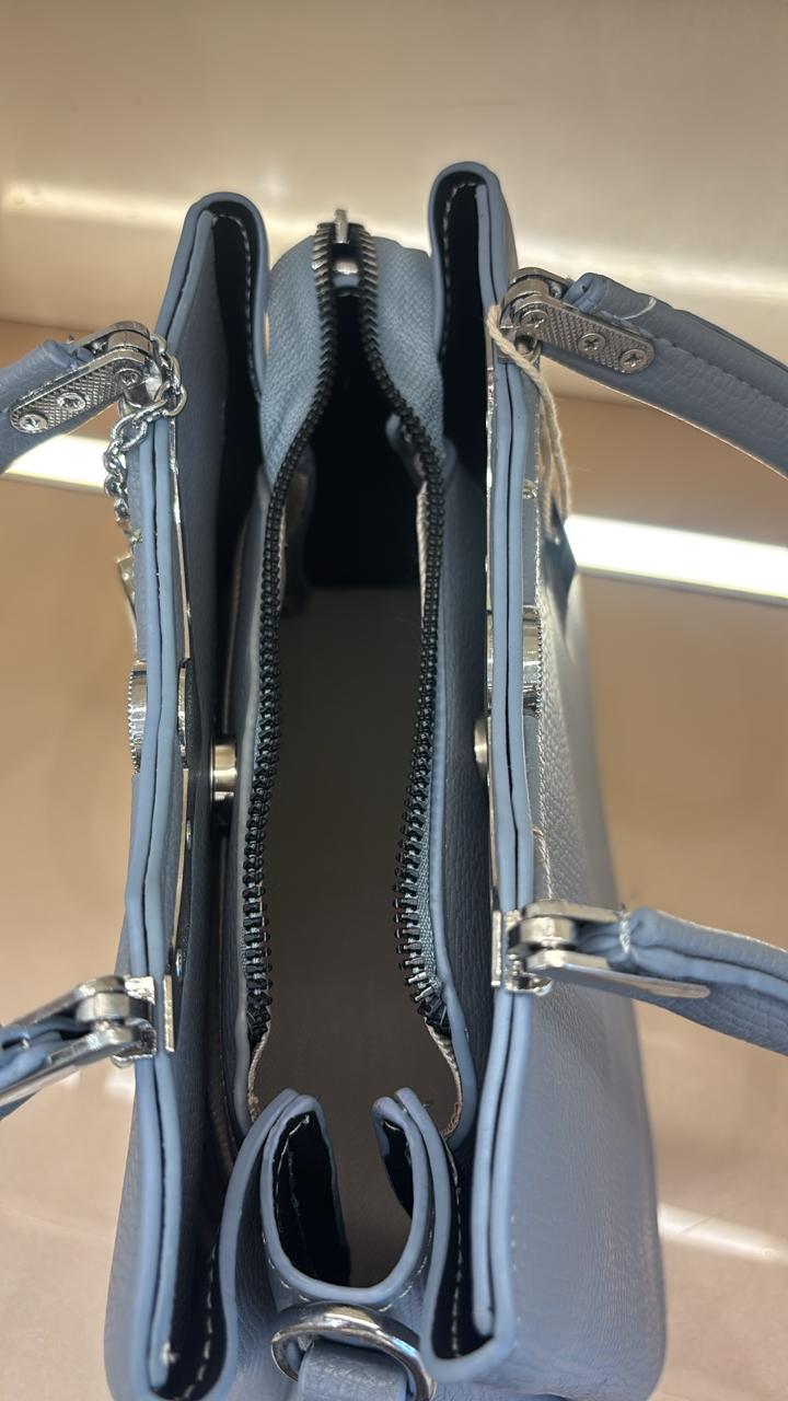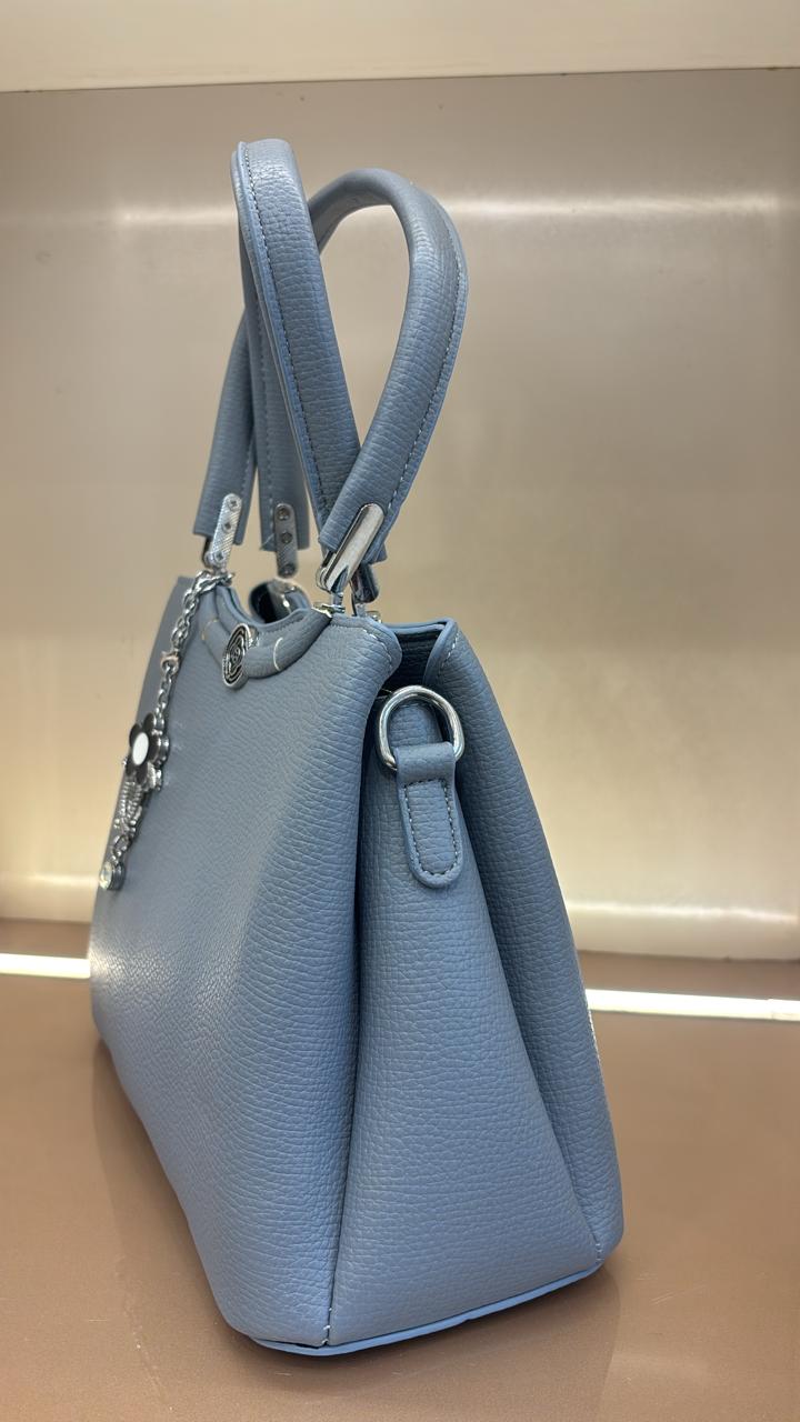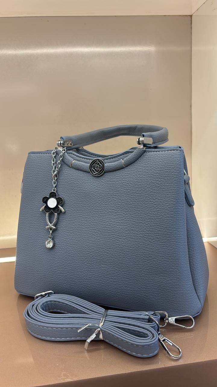 Textured LIGHT GREY leather-like material with structured top handles and an adjustable shoulder strap for versatile carrying. SILVER-tone embellishments on the frame, including a central rose motif and dangling charms (one with a white flower and crystal, another chain-style). Dual top closure with magnetic snap and decorative zipper pull.