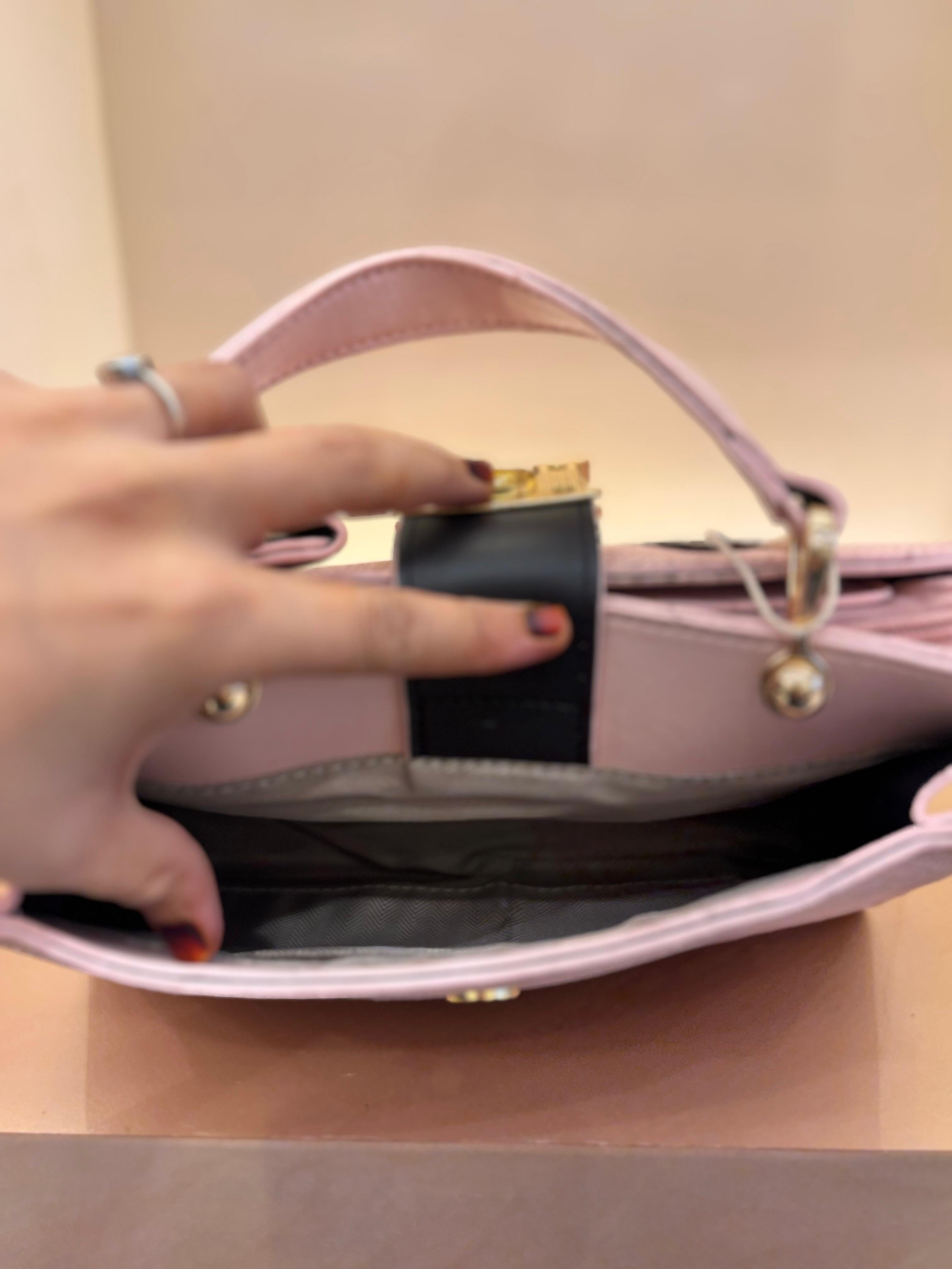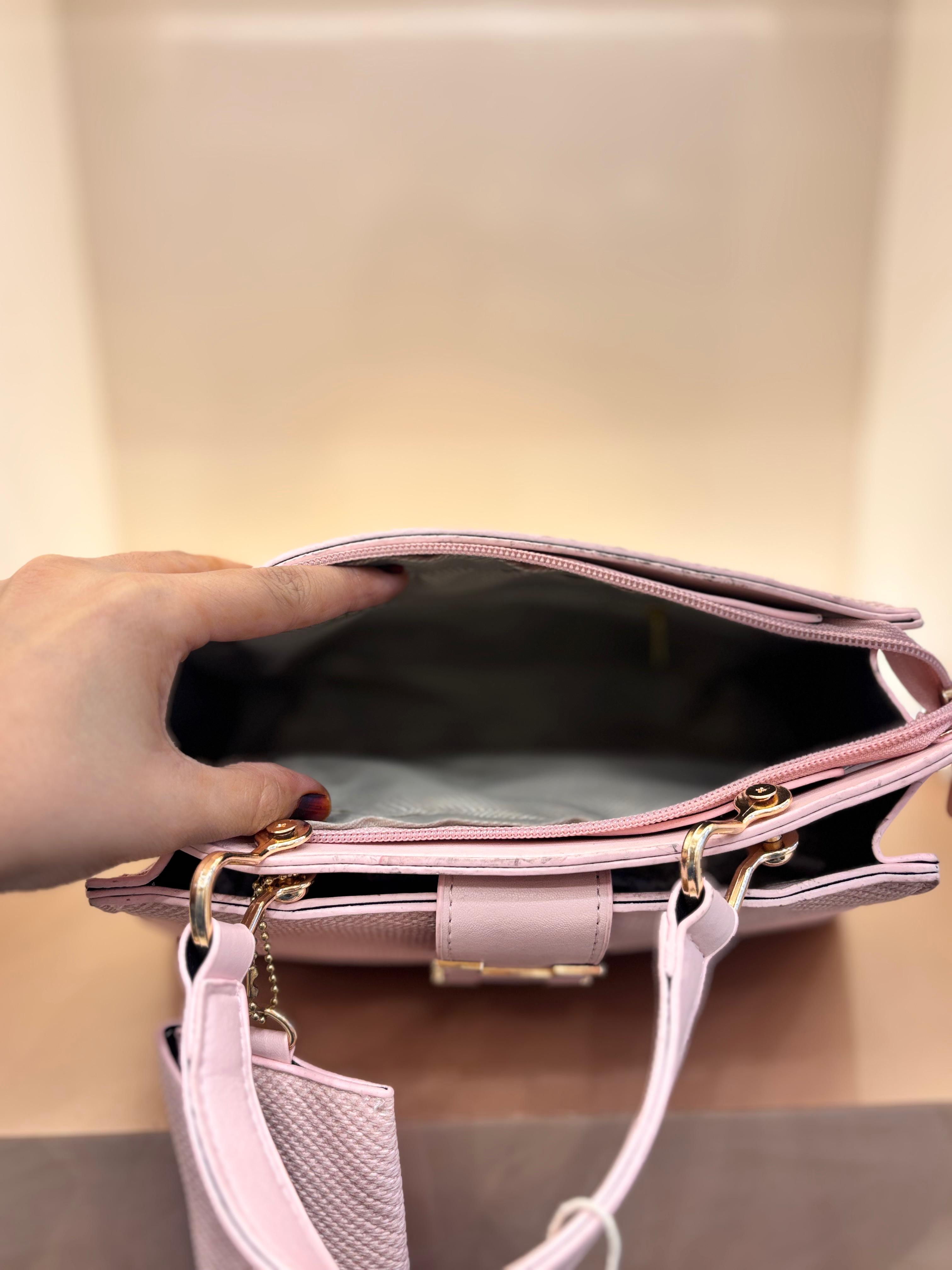Stylish structured handbag crafted with premium textured finish for a classy and sophisticated look. Designed with a bold gold-tone front emblem and matching hardware that enhances its luxury appeal. Comes with a detachable mini pouch for storing small essentials. Ideal for daily use, office wear, or outings — combining elegance with practicality.