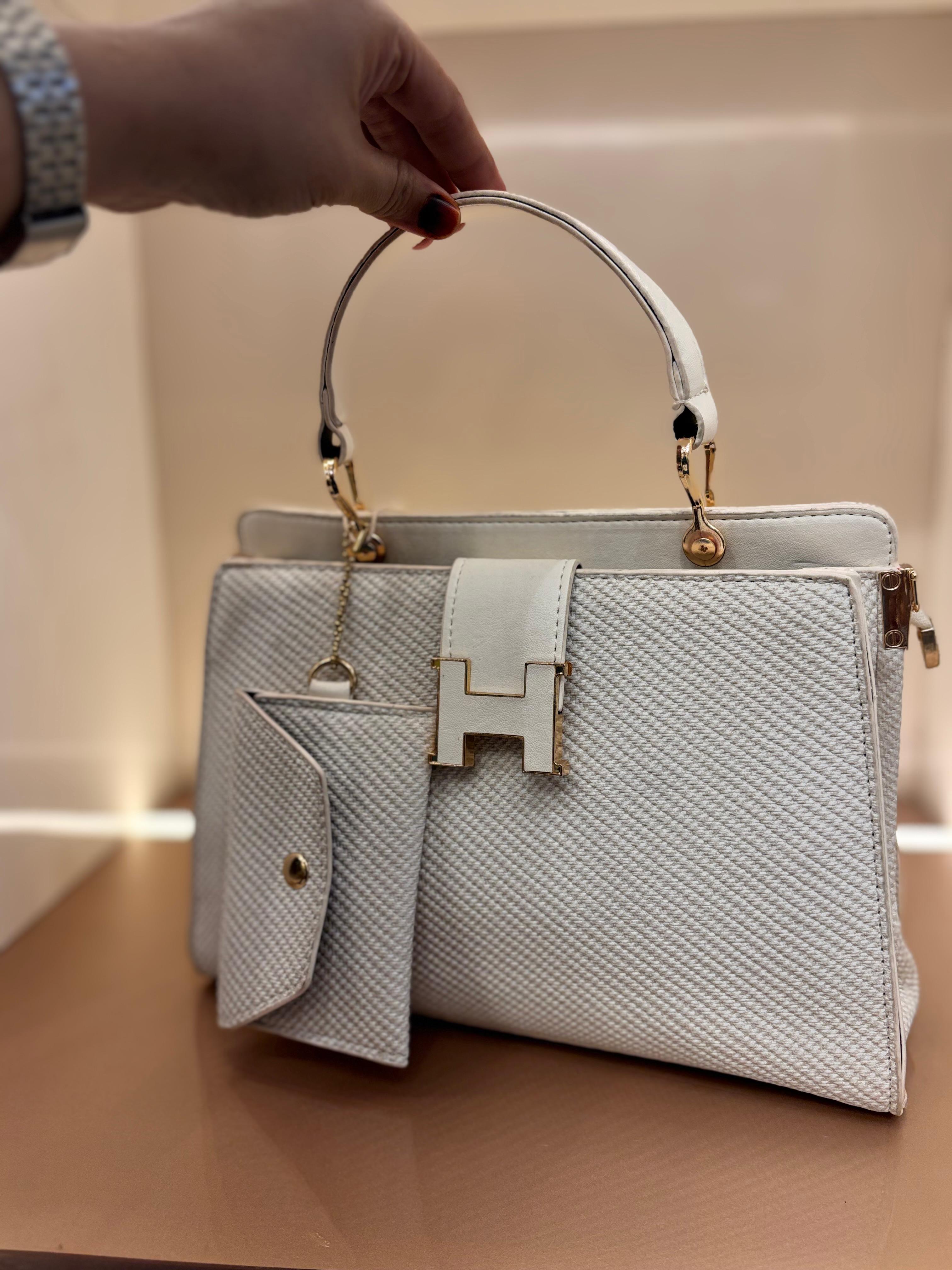Stylish structured handbag crafted with premium textured finish for a classy and sophisticated look. Designed with a bold gold-tone front emblem and matching hardware that enhances its luxury appeal. Comes with a detachable mini pouch for storing small essentials. Ideal for daily use, office wear, or outings — combining elegance with practicality.