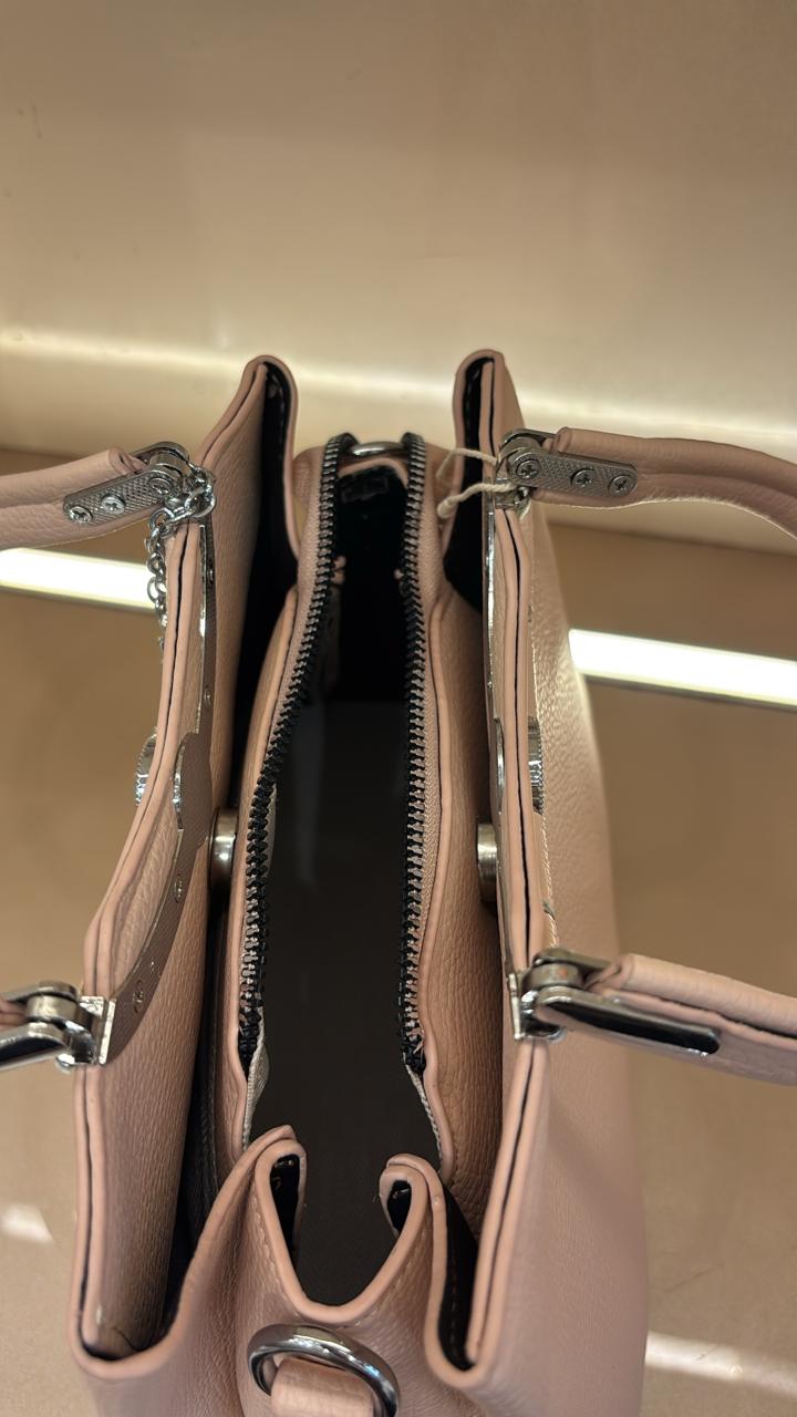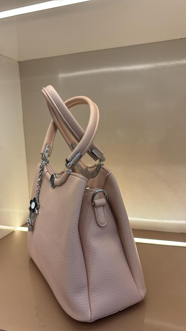 Textured PINK leather-like material with structured top handles and an adjustable shoulder strap for versatile carrying. SILVER