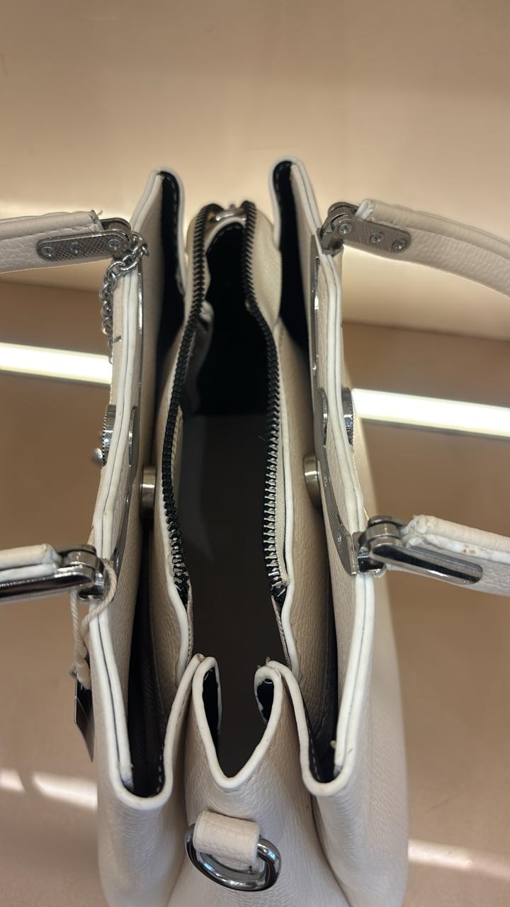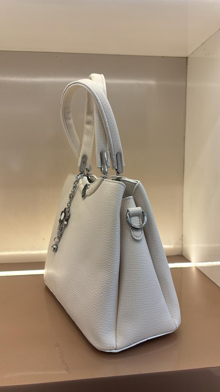 Textured WHITE leather-like material with structured top handles and an adjustable shoulder strap for versatile carrying. SILVER-tone embellishments on the frame, including a central rose motif and dangling charms (one with a white flower and crystal, another chain-style). Dual top closure with magnetic snap and decorative zipper pull.